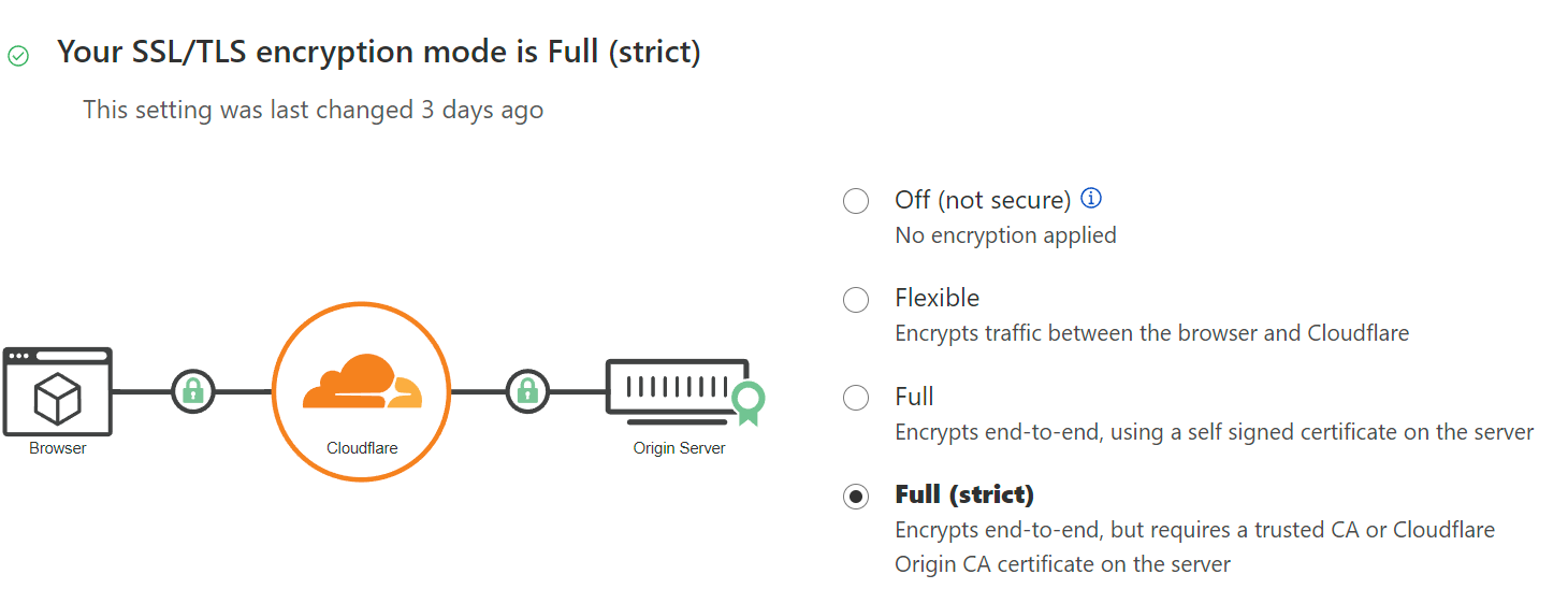 Full mode requires a trusted CA certificate or a certificate generated by Cloudflare. I choose the later one as it has 20 years validation date, so do not need to use ACME every 3 months (like LetsEncrypt).