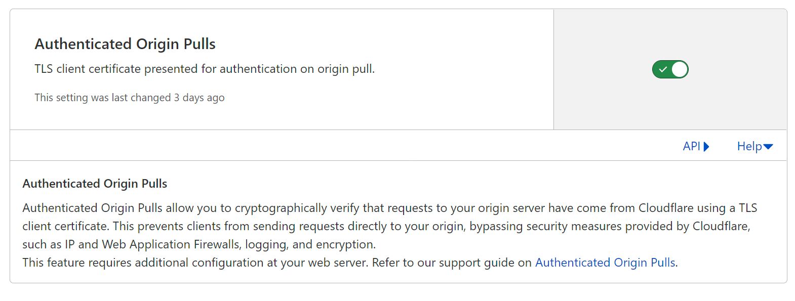 In the virtual machine, I would like all requests are sent from Cloudflare. Their are few ways to do so, like restrict IP range, sign the network request etc… But for Cloudflare free version, the recommended way is “Authenticated Original Pulls“. “Origin Pulls” are the requests from Cloudflare to user’s origin server (In my case, the Virtual Machine on Azure). Cloudflare will send TLS client certificate to origin server, on the VM we can check the cert and block other requests directly sent from user. On Cloudflare dashboard, enable “Authenticated Origin Pulls”: